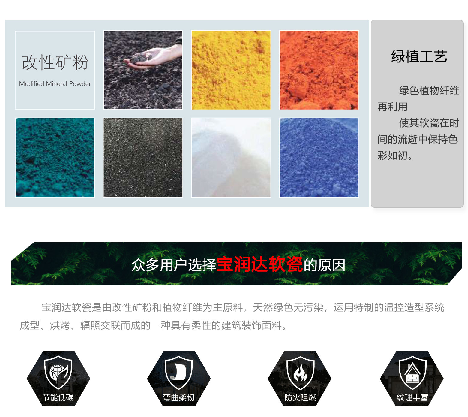 寶潤達外墻軟瓷磚:具有安全環保、抗震防裂、耐火防凍、拒水透氣、耐酸耐堿等優良特性,表現力豐富,是良好的室內外建筑飾面材料